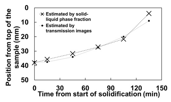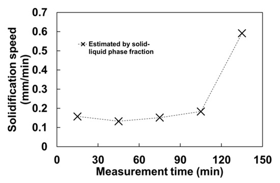 Subsequently, the average solid–liquid interfaces were estimated by the position of the 50% solid-phase fraction for all analyzed images. The results are shown in Figure 15. The horizontal axis shows the time since the solidification process began, and the vertical axis shows the position from the top of the sample. The results are relatively consistent with the time dependence results of a previous study [26,27] estimated from neutron transmission images. Based on the results, we estimated the solidification velocity during the experiment, and this is shown in Figure 16. The result of this study shows a tendency for the solidification velocity to gradually increase with time, which may be reasonable considering the decrease in the liquid-phase volume over time, i.e., the decrease in heat storage capacity.