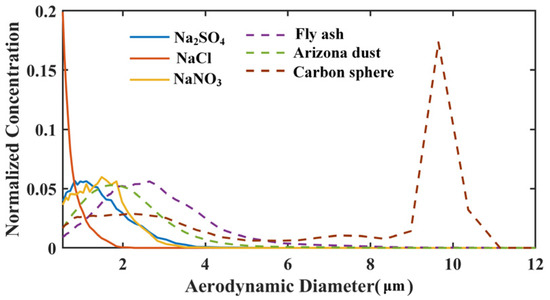 In the experiments, three polystyrene latex particles with different diameters were selected as standard samples that are uniform spheres and have no optical absorption effect. Na2SO4, NaCl, and NaNO3 are typical water-soluble salts and can be generated as quasi-spherical aerosols. The complex refractive index of carbon particles has a non-negligible imaginary part; we selected several carbon samples with various morphological features for experiments. Arizona dust is road dust from Arizona in the United States and can be divided into various categories based on different sizes, which has been used as a standard test for dust and particulate matter for decades. Fly ash is a kind of coal combustion product, which is approximately spherical and contains a variety of metal elements.