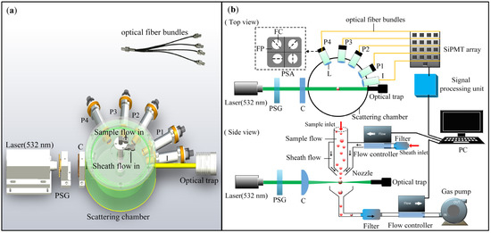 Schematic and experimental setup: (a) 3D view of the optical system; (b) schematic diagram of the experimental device. PSG: polarization state generator; C: cylindrical lens; I: intensity channel at 10°; P1–P4: polarization signal receivers at 30°, 60°, 85°, and 115° respectively; L: a spatial filtering lens module; PMT array: silicon photomultiplier tubes (SiPMT) array; PSA: polarization state analyzer. Each PSA is composed of four film polarizers (FP) fixed at the receiving end where the four FPs work as a four-quadrant polarization analyzing channel to separate the scattering light with different polarization states. The red arrows are the sample inlet and sheath inlet.