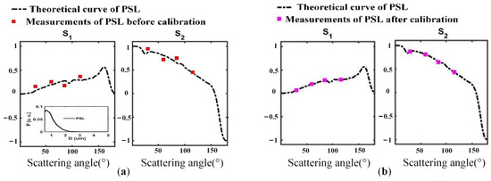However, due to the oscillating scattering angle spectrum of a single particle size, it is difficult to achieve accurate calibrations of polarization signals at several angles. Therefore, we propose a calibration method for the multi-channel polarization signals of our measurement system based on a monodisperse polystyrene sample. By comparison with the theoretical curves shown as a dotted line, we can get a quantitative calibration accuracy of the measured Stokes vectors. As shown in Figure 3, the red markers and the pink markers are experimental results of monodisperse polystyrene particles before and after numerical calibration. The mean deviation of the absolute value of all Stokes parameters is less than 0.07, as shown in Figure 3a, which is determined by the only hardware modification of the optical system, and the final mean deviation of the absolute value of all Stokes parameters is less than 0.01, as shown in Figure 3b, which is the optimal result according to the subsequent numerical calibration.