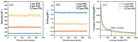 (a) Intensity channel at 10° (each measurement point represents a particle); (b) 85-degree R-Pdop of different PSLs (each point in the figure is averaged over 300 particles); (c) relationship between standard deviation and average number at R-Pdop (85°) (each measurement point represents a particle).