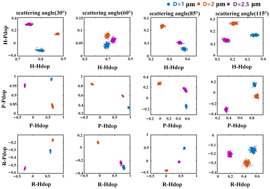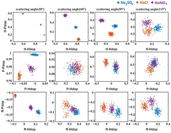 From the scatter distribution of 24-dimensional polarization indices in Figure 9, the four types of sample data show different divisions and clustering. From Figure 10a, P-Hdop (60°), P-Pdop (60°), P-Pdop (85°), and R-Hdop (60°) can distinguish the four types of samples clearly. Besides, Figure 9 and Figure 1 also show similar monotonic changes of these polarization indices, that is, the values of polarization parameters decrease with the increasing particle absorption characteristics (marked by red inverted triangle symbols). This experimental phenomenon is consistent with our previous research reports [32]. We can also see that, in H-Hdop (30°), only the Na2SO4 that has no absorption effect is separated clearly.