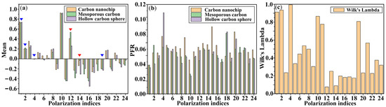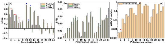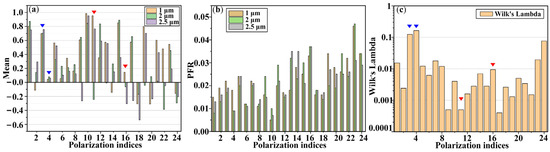 (a) Mean values of multidimensional polarization indices; (b) PFR indices; (c) Wilk’s Lambda indices. The red triangles mark index 2 (H-Pdop (30°)), index 4 (H-Pdop (60°)), index 16 (P-Pdop (115°)), and the blue triangles mark index 10 (P-Pdop (30°)), index 11 (P-Hdop (60°)), index 12 (P-Pdop (60°)).