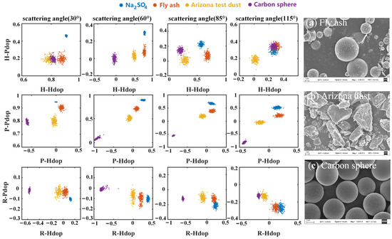 According to Figure 12a, P-Pdop (60°), P-Pdop (85°), P-Hdop (115°), and R-Pdop (30°) of the four types of samples can be well-differentiated. However, through comprehensive consideration combined with PFR and Wilk’s Lambda factors in Figure 12b,c, P-Pdop (60°) and P-Pdop (85°) show feasibility in practical measurement and analysis. Additionally, from Figure 11 and Figure 12a, H-Hdop (30°), H-Pdop (30°), H-Pdop (60°), and R-Hdop (60°) seems insensitive to the aerosol appearances of black carbon samples.