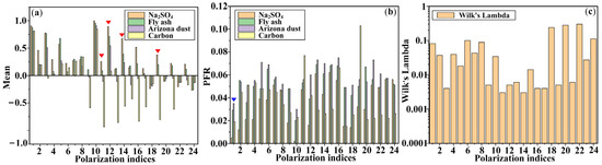 (a) Mean values of multidimensional polarization indices; (b) PFR indices; (c) Wilk’s Lambda indices. The red triangles mark index 11 (P-Hdop (60°)) and index 16 (P-Pdop (115°)), and the blue triangles are index 3 (H-Hdop (60°)) and index 4 (H-Pdop (60°)).