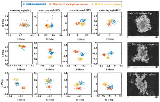 24-dimensional polarization indices distribution of four kinds of aerosol samples with irregular morphology. The SEM image of samples are listed in the right column: (a) Carbon nanochip; (b) Disordered mesoporous carbon; (c) Hollow carbon sphere.