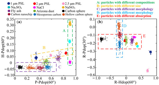 Finally, we select four polarization parameters from the above experimental results and show the scatter data distribution of the 12 types of aerosol samples used in this paper. Five boxes are used to mark some regular phenomena of polarization indices between different samples. If we observe the green frame A in Figure 13a, we can find that three water-soluble salts are completely indistinguishable based on P-Pdop (60°). Actually, according to the above figures, it can be noticed that P-Pdop (60°) is easily influenced by many aerosol features, such as particle size, morphology, and optical absorption. Based on their distribution perpendicular to the horizontal axis (P-Pdop (60°)), the key attribute difference among three water-soluble aerosol samples is the refractive index connected with different compositions. The H-Pdop (60°) of various aerosol samples marked by the yellow frame B and purple frame C also can be supported by the above experimental data. H-Pdop (60°) is a good indicator to distinguish aerosol composition but is insensitive to aerosol size and morphology; therefore, in group C, the polarization index distributions of four types of carbon samples with respective morphological characteristics are perpendicular to the vertical axis (H-Pdop (60°)). The case of three PSL particles with different sizes in frame B can be explained in a similar way. Furthermore, based on the above experiments, R-Hdop (60°) is sensitive to aerosol absorption and insensitive to aerosol morphology, and R-Pdop (30°) is not easily affected by optical absorption. So, in blue frame D, the polarization data distribution of three aerosol samples with different morphologies is perpendicular to the horizontal axis (R-Hdop (60°)). If combined with the regular pattern in Figure 13a, we can easily estimate whether morphology or size is the key difference of aerosol properties among various samples. For the red frame E in Figure 13b, the polarization data are distributed perpendicular to the vertical axis (R-Pdop (30°)), corresponding to the inherent absorption attributes from strong to weak.