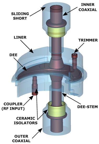 The RF design of the INFN-LNS superconducting cyclotron, presented elsewhere [,], is based on three vertical half-wave (/2) coaxial resonators, placed 120 apart along the median plane (i.e., the area where particle acceleration occurs) and operating in the frequency range of 15–48 MHz. In the median plane, an accelerating high voltage electrode, named “Dee” for its shape, is connected to the shorted inner conductor lines (“Dee-stem”). The grounded outer conductor, called “Liner”, is the wall of the vacuum chamber region. In the gap between the RF oscillating high-voltage Dee and the grounded Liner, an accelerating electric field is formed with an intensity inversely proportional to the distance between facing surfaces. For the sake of simplicity, only one of the three identical RF cavities is considered in our model. A picture of the accelerating vacuum chamber is shown in Figure 1. It is composed by the upper and lower liner (only the inferior one is shown) and the inner part of the cryostat. The RF cavities including coaxial stem and Dees are installed in the valley of the liner. The 3D geometry of the actual RF cavity adopted in our model is shown in Figure 2. It is fully comprehensive of all the RF details and it has been derived from the mechanical drawings, including the variations done along the years.