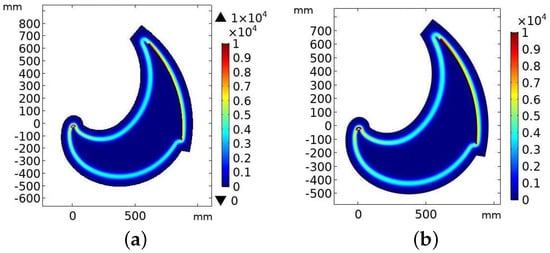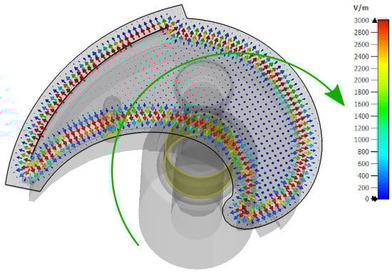 The parasitic electric field component produced in the standard, symmetric sliding shorts, configuration was already presented in Figure 10. Same electric field analysis has been performed for the “asymmetric shorts” configuration. The electric field produced by the latter configuration is reported again in Figure 15 for easier comparison with the same color range scale of Figure 16 to simplify the comparison. Thanks to the applied asymmetry, it can be observed that the undesired electric field parasitic component corresponding with the center of RF cavity has been reduced to negligible values.