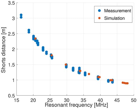 Sliding short distance from the median plane vs. TEM mode frequency. Eigenmode simulations performed with CST (red dots) are compared with experimental measurements (blue dots).