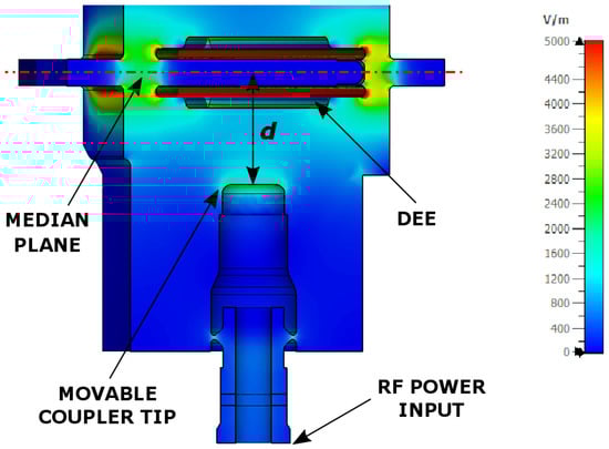 In this section we describe driven RF simulations in order to analyze wave propagation, coupling and impedance matching thanks to the -parameter evaluation at the RF power coupler port. A tunable capacitive coupler is used to couple the RF power from the coaxial feeder line to the cavity. In our driven RF simulation, the input port is a coaxial surface at the bottom part of the coupler design (see Figure 6). A detailed view of the electric field in the region close to the coupler is shown in Figure 6: it is possible to see the high electric field corresponding with the two gaps between the Dee and the Liner walls. Around the coupler tip, the electric field corresponds to the surface facing the Dee and in the small gap between the coupler and its supporting flange on the bottom part of the Liner. Because of this small gap and high electric field gradient, a finer meshing of this region is crucial for the quality and accuracy of the power coupling simulation.