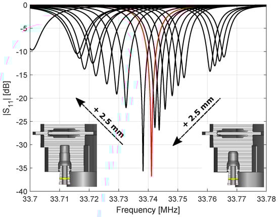 The coaxial-to-cavity impedance matching is obtained by varying the distance d between the movable coupler tip and the cavity median plane (see Figure 6). The coupling capacitor has a stroke of 50 mm in the interval from mm to mm. The optimal coupler-to-median plane distance, which gives the best impedance matching, depends on the cavity operating frequency. The behavior of the system has been well-reproduced by our model exemplified with fixed shorts position giving a resonant frequency of MHz. In Figure 7 the simulated -parameter variation can be analyzed when the coupler is moved along its entire stroke with steps of 2.5 mm. It is relevant to notice that the trend of the S-parameter by moving the coupler is in accordance with the experimental behavior.