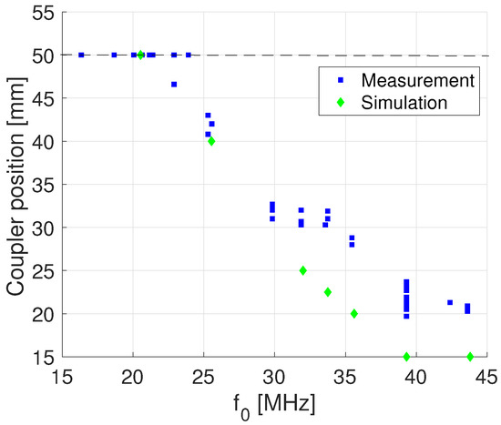 For frequencies lower than 25 MHz, the coupling is constrained to the 50 mm stroke limitation (corresponding to mm). While the simulations allow a global optimization able to find the absolute best working point into the three-dimensional space parameters (shorts, coupler, and trimmer position), in the real machine operation also slight differences on the shorts position can result in few millimeters of dispersion and in -parameter local minima values where, however, the matching still remains very good ( dB). The maximum discrepancy between the average of experimental data and the simulated value is only about 8.5 mm at 33.7 MHz. Figure 7 shows that when moving the coupler 7.5 mm from the best position, the matching is still very good since | goes from dB to about dB.