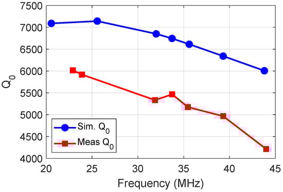 The unloaded quality factor has been determined from the 3 dB bandwidth measurement made with a Vector Network Analyzer (VNA). As expected also from other analyses in literature [,,,], the measured quality factor is less than the simulated values due to many factors: sliding contact, losses to brazed and welded joints, temperature increase, surface oxidation and cleaning, etc. A mismatch ranging from 16 to 30% is shown in Figure 9.