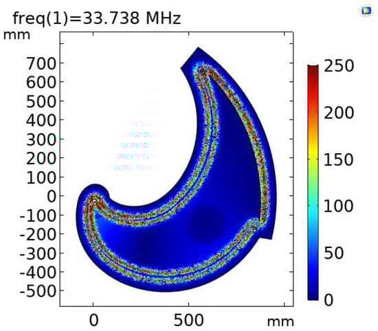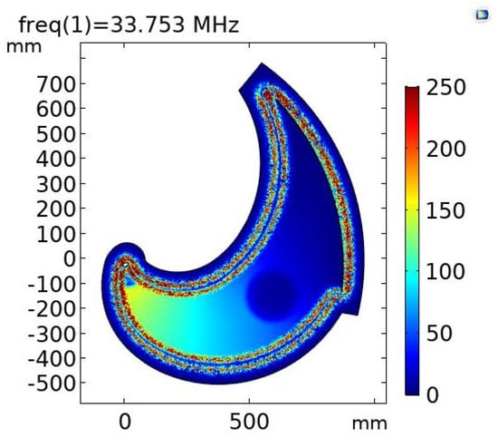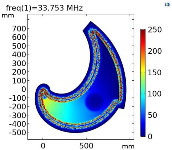 Typically, any cyclotron RF cavity design has a vertical symmetry with equal half upper and lower structures. The symmetry of the cavity and the TEM fundamental mode operation ensures the best condition for electric field distribution in the beam region, parallel to the middle plane. However, the “real” machines—such the INFN-LNS compact cyclotron under investigation in this work—have some intrinsic limitations. The coupler is located on the bottom side of the Dee and the trimmer in the upper side. These elements break the symmetry of each RF cavity. Before of the present work this asymmetry was not quantitatively evaluated and the operation was driven by experimental evidence. In the following, to be able to evaluate the amplitude of the two components of interest, we used the expression = to extract the module of the component parallel to the middle plane, and the expression = to extract the module of the component orthogonal to the middle plane. The superscript r and i identify the real and imaginary parts of the solution, respectively. The electric field component orthogonal to the median plane, introduced by this asymmetry, was computed and presented in Figure 10. The color-scale of Figure 10 has been cut to 250 V/m to better identify the amplitude in the region of interest.