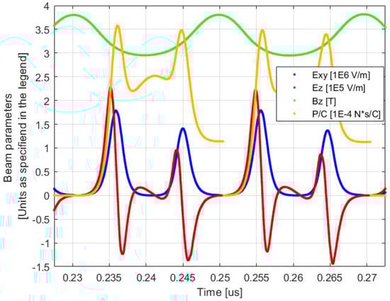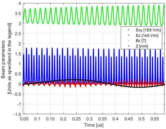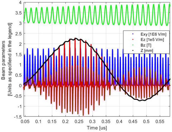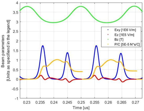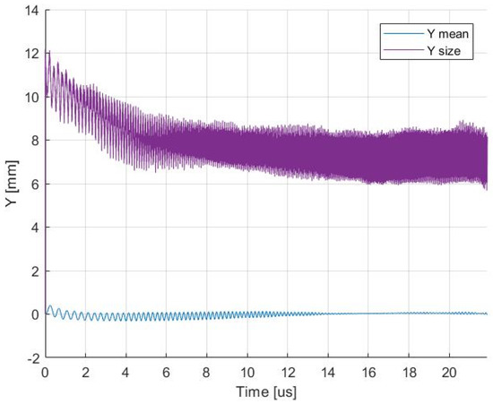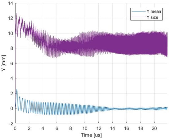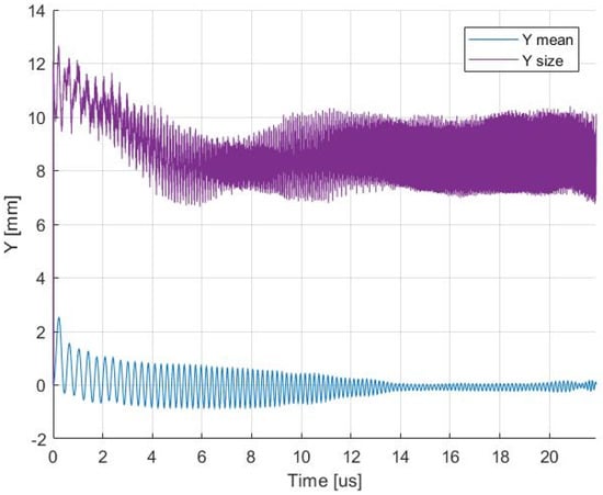 Reducing the amplitude of the electric field component orthogonal to the middle plane, the amplitude of the oscillation, as visible in Figure 20, is consequently reduced, while the 0.5 us oscillation period is not modified because it is related to the beam inertia and the magnetic focusing effect, which remain unchanged. The reduction in beam oscillation amplitude results is correlated to the reduction of the transferred momentum (shown in Figure 21) by a factor 4.
