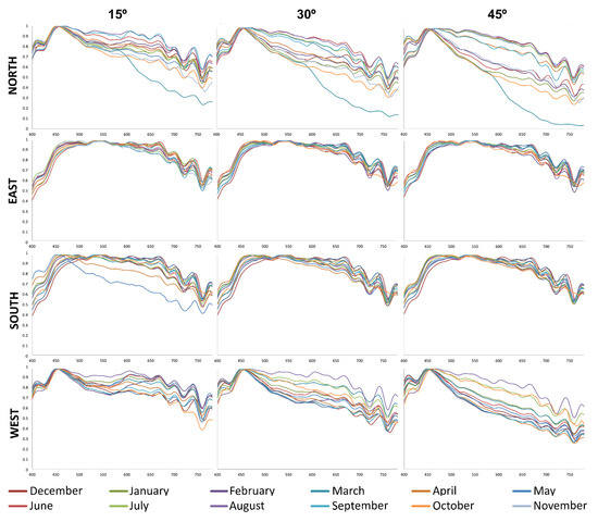 The highest irradiances can be found in the east direction at 30°–45° in practically every month except in December, January and October. In those three months, at 15°, the irradiance is higher than that at 45°. This is followed by the south direction, except in January and November. In those two months, at 15°, the irradiance is higher than at 45°. The lowest irradiances are in the west orientation except in five months (February, March, September, October and November), which slightly exceed the values in the north direction (Table 1 and Figure 2). From April to September, the sun is located in the east and at the highest latitudes (Table 1 and Figure 2). In the normalized SPD curves (Figure 1), spectral variations were found throughout the months of the year and depended on the cardinal points at which the measurements were taken.