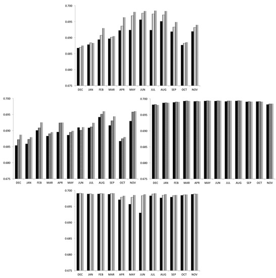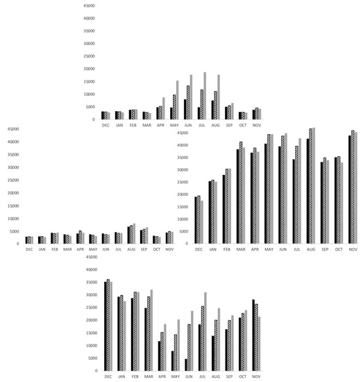Photopic illuminance (lux) values measured depending on the season (from December 2018 to November 2019); orientation of north (top), east (right), south (down), and west (left); and elevation from the horizontal level of 15° (black), 30° (striped), and 45° (grey).