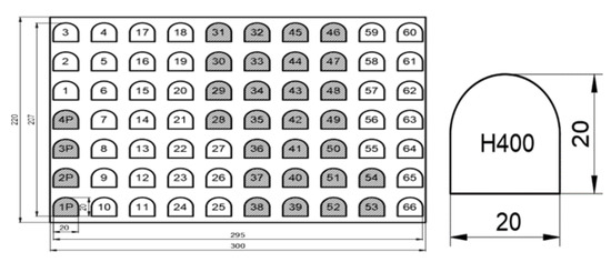 The dimensions of the semi-finished product used in the experiment are 300 mm, 220 mm and 8 mm for length, width and thickness, respectively. The 5.181 kg plate was cut, as shown in Figure 1, to perform a complete factorial experiment, based on an experimental plan, to determine the optimal value of the input parameters that influence the cutting width.
