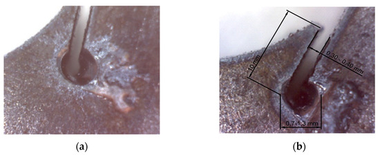 UNIOR 701 caliber (from Unior Tools manufacturer) was used to measure the slit at the straight side. In the experiment it was used to measure the cut through the material by probing, based on the pass-by-pass principle. Laser piercing is the first contact between radiation and material. A conical channel is produced, because the geometry of the laser beam has a conical appearance, while around it the cut edges are burnt by the oxidation reaction. With the help of a Celestron digital microscope, the plate channel was studied for parts 1 and 28 (replica of part 1), in which minimum values of the input parameters were used (Figure 3a,b).