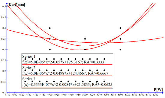 The graphs are built to find the dependence of the cutting width on the laser power. Series 1 was run at 4900 W in three references, 5000 W in three experiments and 5100 W in three cases, at the same time with the low pressure of 0.45 bar kept constant. Nine values for the cutting width resulted. The coefficient of determination R2 = 0.33 is low. For series 2, the procedure was similar, slightly increasing the gas pressure to 0.50 bar (Figure 4).