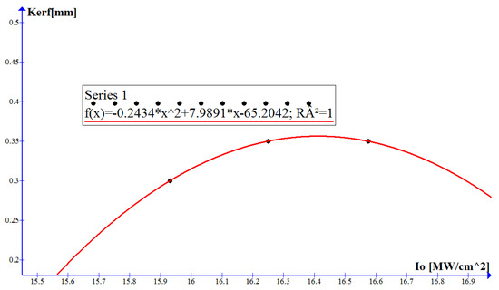 The quadratic regression model of the cutting width as a function of the incident intensity produced by the laser radiation at the entrance to the material has the expression:
