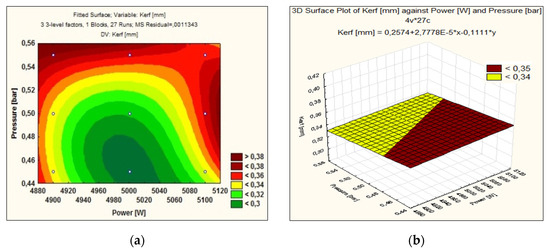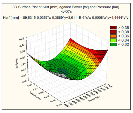 - The shape of the Kerf variation in the RSM model is a paraboloid representing a quadratic surface that indicates a more pronounced influence of the laser power than the gas pressure. The Kerf graph depending on the laser power is steeper and longer compared to the graph representing Kerf depending on the cutting gas pressure which is less deformed, that is a curve less pronounced;