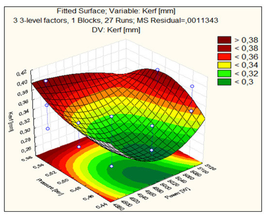 Specifically, the best cutting width (0.30 mm) is obtained for laser power 5000 W and auxiliary gas pressure 0.46 bar. For the response confidence interval of ±1 mm (width = 0.26–0.28 mm), the graph shows values of the laser power between 4980 and 5020 W, at the same time as the gas pressure between 0.45 and 0.48 bar. The response surface combines the shape of a classical paraboloid (in the centre) with a hyperbolic paraboloid (at the extremes) and shows that the cutting width has a variation of the shape of the Gaussian bell, with the tip on the average axis of laser power. If the laser power is maintained at average values and the gas pressure increases, the bell rises, which means that the cutting width increases. The predicted graph indicates a significant influence of the input parameters (power and pressure) on the cutting width using the RSM model.