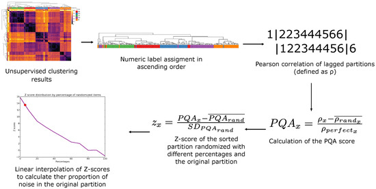 In statistics, serial correlation (SC) is a term used to describe the relationship between observations of the same variable over specific periods. It was originally used in engineering to determine how a signal, for instance, a radio wave, varies with itself over time. Later, SC was adapted to econometrics to analyze economic data over time principally to predict stock prices and, in other fields, to model-independent random variables [6]. We applied the SC to propose a manner to quantify how good the grouping is of a posterior classification just by retrieving the results of unsupervised clustering analysis. Thus, we propose a novel relative score, PQA, to solve the subjectivity of the visual inspection and to quantify statistically how much noise is embedded in the results of clustering analysis.