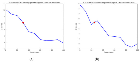Z-score distribution by percentage of randomized items. (a) Dataset from Jie Shen et al. (b) Dataset from Tooyoka et al. The red dots represent the Z-score interpolation of the corresponding data sets.