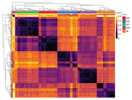 Cluster analysis of distance among gene regulatory networks and theoretical network models. The abbreviations and colors used in the posterior classification are as follows: Barabasi–Alberts (BA, red), Erdos–Renyi (ER, blue), scale-free (SF, green), hierarchical modularity (HM, purple), and biological networks (Bi, orange).