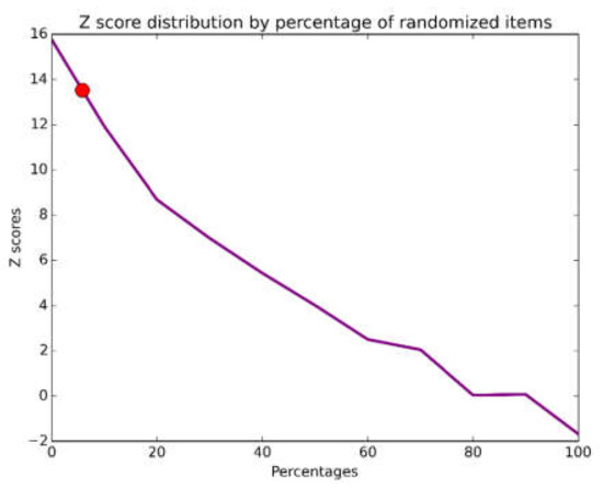 Z-score distribution by percentage of randomized items of vector of profiles (VP) from genetic regulatory networks. The red dot represents the Z-score interpolation of the actual data set.