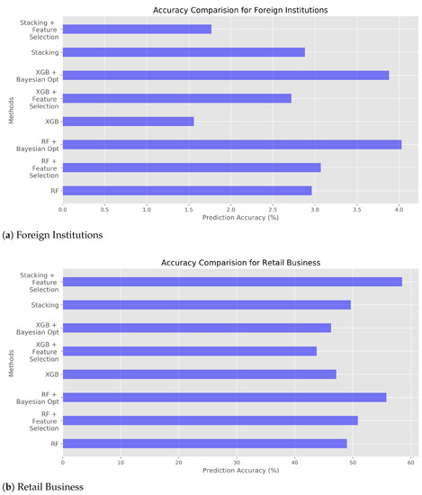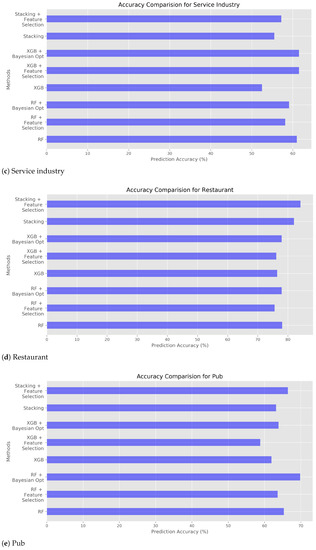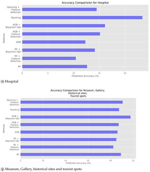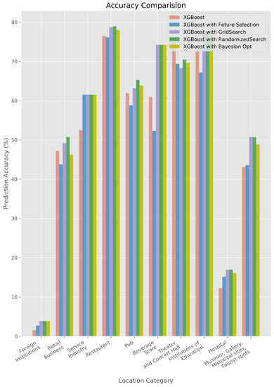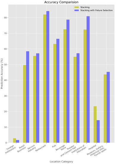 The total representation of accuracy of three different models can be found in Table 9, Table 10 and Table 11. Figure 1, Figure 2 and Figure 3 aforementioned shows the accuracy of each experimental condition. For the Stacking, hyperparameter optimization cannot be made due to the nature of Stacking, meta learning. Once hyperparameter optimization is applied to Stacking, every model in level 1 of Stacking must contain hyperparameter optimization which will result in drastic increase of execution time. Actually, Stacking with feature selection shows the prediction accuracy as high as RF and XGB with hyperparameter optimization. Figure 6 shows prediction accuracy for each location category. The cases of foreign institutions and hospital are somewhat incredible due to low accuracy, and due to smaller number of raw data. For other location categories, prediction accuracy is in the range of 50% to 80%. As aforementioned, too various subcategories shows somewhat low accuracy while ramification of subcategories could lead to higher prediction accuracy. For instance, distinct location categories such as restaurant, pub, beverage store, theater and concert hall show high accuracy.