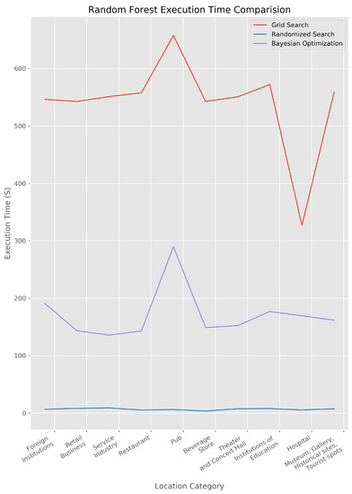 Table 7 shows the results numerically: hyperparameter optimization and prediction accuracy. In Table 7, hyperparameter value of RF are chosen as n_estimators, max_depth, bootstrap, respectively and in case of XGB, n_estimators, max_depth, learning_rate, booster are shown. It is notable that feature selection leads to accuracy decrease however prediction accuracy can be increased with hyperparameter optimization. For most of Random Forest optimization, bootstrap is used for the most of location categories. Bootstrap is useful for smaller number of input data. In addition, different method of optimization for the same location categories leads to similar value of max_depth or n_estimators. Interestingly, different hyperparameters can lead to similar accuracy. Maybe the big structure generated in the leaning process by Random Forest and XGBoost enables convergence of accuracy. Especially, XGB is highly dependent on the selection of booster. It is important to select adequate booster for XGB. In addition, selection of number of iteration for bayesian optimization is also important. In case of theater and concert hall, low number of iteration for bayesian optimization leads to booster of ‘gblinear’. And the accuracy is reduced in 20% comparing to that of grid search or random search. Linear function of ’gblinear’ shows big gap in accuracy comparing to ‘gbtree’ and ‘dart’ which is based on tree structure. In addition, extra number of iteration leads to low prediction accuracy due to overfitting. We concluded that the number of iteration is in the range of 50 to 60.