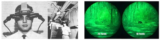 The head-mount displays (HMD) introduced by Ivan Sutherland’s research team were the first HMD prototype (left). The night vision device introduced by the US Army during the Vietnam War allows the viewing of targets in low light and range estimation (right).