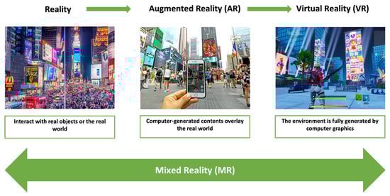 Virtual reality (VR) and mixed reality (MR) are frequently mentioned, but how do they relate to AR? Figure 2 presents the MR continuum, which depicts MR as the merging of the virtual and natural worlds along with the digital information continuum. The VR environment is entirely generated by computer graphics, which disconnect users from the real world and transfer them to an artificial digital environment. These immersive experiences are usually applied to training, education and video games. AR lies between reality, or the natural world, and VR to integrate virtual information into the actual physical world’s live view. It provides a unique experience by merging the actual environment with digital information, allowing users to engage and absorb knowledge in a much more efficient manner [6,7].