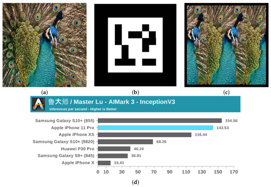Augmented reality markers typically display unclear information and demand users to change the original picture in some way, either partially or completely (a–c). (d) depicts the performance of machine learning inference across several phone models using InceptionV3. (a) Template marker; (b) Bar-code marker; (c) Pictorial bar-code marker.