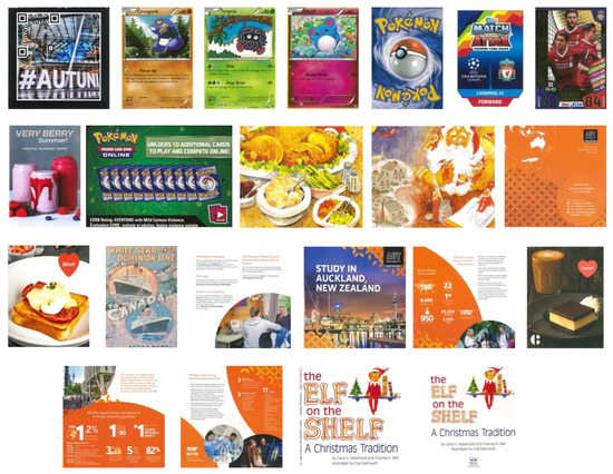 Image targets. We integrated approximately 22 different rectangular-shaped images in this study. Each of these images has a different design, and some of them have a very similar colour. This setup is believed to help us qualify how good the dataset is in terms of identifying the similarity objects. The images were from four different categories: (1) trading/business cards; (2) posters; (3) children’s educational books; and (4) food advertisements. The details of target markers are presented in Table 2 and Figure 9.
