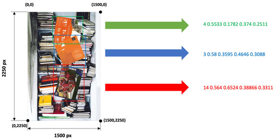Data labelling. YOLO is the deep neural network that we use in this study and is described in detail in Section 4. In YOLO, the bounding box has four values, [object_id, x_centre, y_centre, width, height], as shown in Figure 10. [object_id] represents the number corresponding to the object index in the class names list. [x_centre, y_centre] represents the centre point coordinate of the bounding box, which is normalised to between 0 and 1 by dividing by the width and height of the image. [width, height] represents the width and height of the bounding box, which is normalised to between 0 and 1 by dividing by the width and height of the image.
