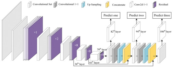 YOLOv3 deep neural network model. The main principle of YOLO is using the entire image as the input to the network and directly returning the bounding box coordinates and corresponding class name. YOLOv3 [32] is the next generation of YOLOv2 [33] and contains significant improvements. YOLOv2 uses Darknet-19 as its backbone and an additional 11 object detection layers. However, YOLOv2 struggles with detecting small objects, whereas YOLOv3 provides a state-of-the-art performance by using residual blocks, skip connections and upsampling, as shown in Figure 11. It uses Darknet-53 as the backbone, which is reported to be more efficient than Darknet–19, ResNet-101 and ResNet-152 [34].
