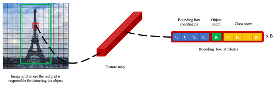 The main difference between YOLOv3 and its ancestors is the prediction of three different scale levels. Each of the input images is downsampled by 32, 16 and 8, respectively. The detection is first made at the 82nd layer after the downsampling process of the original input from the previous 81 layers. The 81st layer has a stride of 32, meaning that if we have an image of 416 × 416, then the resultant feature map would be 13 × 13 × depth. Then the feature map from 79th layer upsampled by two to dimensions of 26 × 26 × depth is depth concatenated with the feature map from the 61st layer. The combination feature maps are subjected to a few convolutional layers before reaching the 94th layer, where the second detection occurs. The same procedure is executed again, where the feature map at the 94th layer is subjected to a few convolutional layers and depth concatenated with the feature map from the 36th layer. The final detection occurs at the 106th layer, yielding the feature map of 52 × 52 × depth. Detections at three different scale levels help to address the limitations around detecting small objects in YOLOv2. The 82nd prediction layer is responsible for detecting large-scale objects. The last prediction layer is responsible for detecting the small-scale objects, whereas the 94th prediction layer is suitable for medium-scale objects. The predictions are made by applying 1 × 1 detection kernels to the feature map, as shown in Figure 12. At the tensor procedure level, the YOLOv3 network divides the input image into an S × S grid of cells. Each cell is responsible for predicting bounding boxes B and class probabilities C of the potential objects whose centres are inside the grid cell. Each bounding box has five attributes: four bounding box coordinates (, , , ) and an object confidence score . The confidence score represents the probability of a box containing an object and usually falls between 0 and 1.