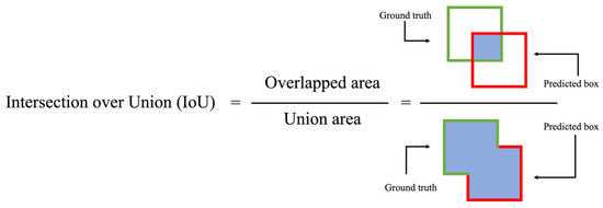 In each case, we usually set up a default threshold value. If the IoU value is higher than the threshold value, the prediction is defined as , otherwise . The recall value is calculated in Equation (6) by using , and the false negatives .