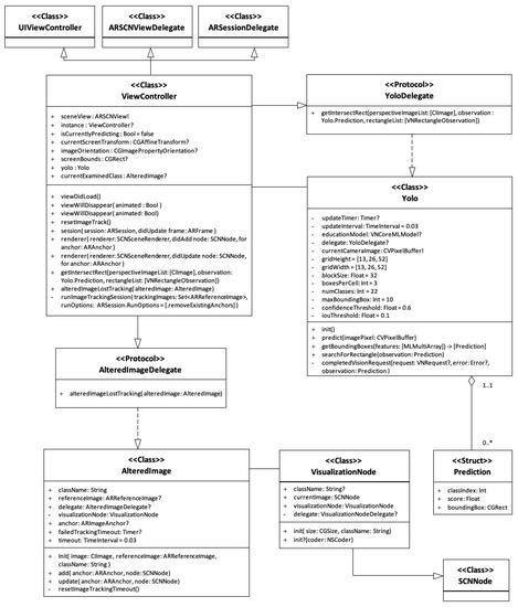 iOS application structure. The class diagram in Figure 14 presents the relationship between different Swift classes and how they fit and work together under the application system. The diagram is divided into three parts: (1) ViewController; (2) Yolo; and (3) AlteredImage. The ViewController class is the main controller of the application that holds the ARSCNView. This class is responsible for rendering the virtual objects and updating the application states. Every instruction is executed on the main UI thread as the system does not capture the camera’s input frame in this class. Hence, there is no main thread blocking issue due to the video feedback execution.