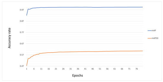 Synthetic dataset performance on YOLOv3. We conducted different experiments to evaluate our proposed method. All of the experiments used Python 3.8 to train the algorithm on the Linux system with Intel i7-9700F 3.0 GHZ CPU and Nvidia RTX 2080 Super (8 GB memory). We trained our synthetic data with two different YOLO models: YOLOv3 416 for 20 h and YOLOv3 tiny for 13 h. The training loss results are shown in Figure 15, and the mean average precision values (mAP and mAP50) are presented in Figure 16. The results indicate that the YOLOv3 model yields more than 80% in mAP and more than 55% in mAP50 when utilising our synthetic dataset.