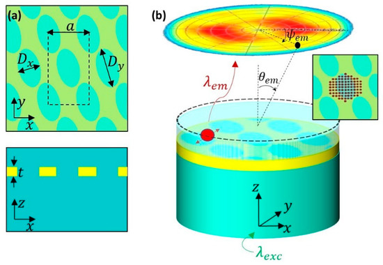 - Michieli, N.; Kalinic, B.; Scian, C.; Cesca, T.; Mattei, G. Emission Rate Modification and Quantum Efficiency Enhancement of Er3+ emitters by Near-Field Coupling with Nanohole Arrays. ACS Photonics 2018, 5, 2189–2199. [Google Scholar] [CrossRef]