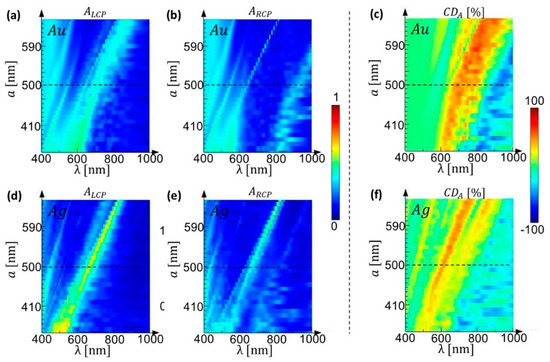 Passive simulations of chiral absorption in Au-ENHA and Ag-ENHA as dependences on lattice parameter a. ENHA diameters are scaled as Dx = 280*a/500, Dy = a, while the angle offset from the hexagonal symmetry is held at 15°. (a) ALCP, (b) ARCP, and (c) CDA for the Au-ENHA; (d) ALCP, (e) ARCP, and (f) CDA for the Ag-ENHA.