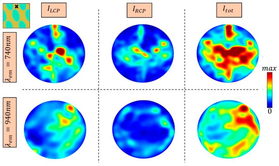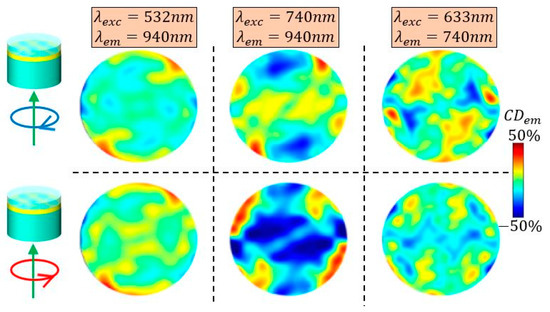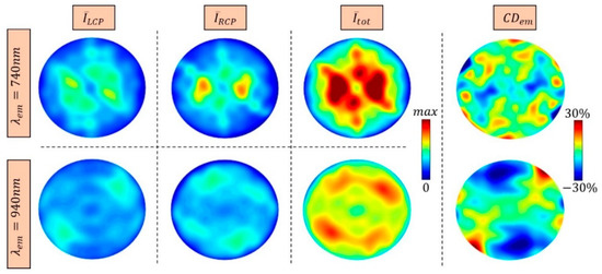 Finally, we apply Equation (3) to calculate the total, LCP, and RCP fields emitted by the ensemble of 85 dipoles, Figure 6. Here we consider the dipole weights with respect to the shared geometry between the neighboring cells, while we do not consider confinement at the excitation wavelength. As is expected, higher emission at 740 nm corresponds to higher confinement of this wavelength at 120 nm. Moreover, at 940 nm the light was directed towards larger angles in the far-field, in agreement with diffraction-governed optical phenomena. More importantly, in the direction of the maximum emission at 740 nm (Ψem~0°) the overall CDem switched the sign between the two wavelengths, just as in CDA. Therefore, passive ENHA chiral properties directly influence their coupling with the achiral emitting layer situated in the index matching layer. Absolute CDem values reached 20% and 30% for 740 nm and 940 nm, respectively.