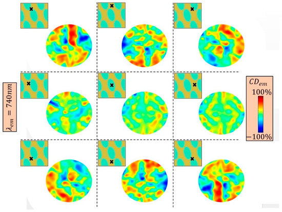 In Figure 5, we show chirality of typical dipole positions for the emission at 940 nm. Even though emission intensity was lower (Figure 3), for most positions there was a strong positive chirality in the central part of the hemisphere, which is wider and more pronounced with respect to Figure 4. Again, CDem decreases towards the dipoles closer to the ENHA center.
