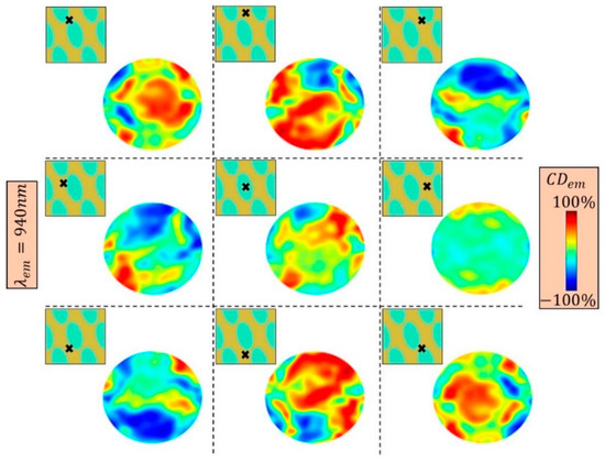 CDem can be enhanced and directed differently in the far-field by changing the polarization of the excitation. The rich chiral behavior of ENHAs can be used to optimize the desired far-field properties and chirality for a specific application in many ways. Take as an example an ENHA coupled with molecules which emit at 940 nm. If one needs high CDem emitted directly to the far-field center (θem~0°, Ψem~0°), the excitation can be tuned to enhance the dipoles on the upper left and lower right positions in the unit cell, as seen in Figure 5. Another requirement can be a high contrast ratio between the CDem with excitation switching from RCP to LCP. As an example, the far-field CDem distributions in Figure 9b show that this is possible for light directed in θem~10° cone, and it can be further optimized. Therefore, proper engineering of the field confinement at the excitation wavelength can enhance the contribution of the dipoles which give the highest CDem of the same sign, while the change to their polarization can tune the desired property in the emitted far-field. Moreover, the position of the ensemble in the z-direction can be matched with the high chiral properties. Finally, excitation angle of incidence plays can be used to couple the incident excitation light to the resonance of the nanostructures [41,43,45,46]; e.g., in Figure 8a, this would lead to higher intensity of the emitted light and to an additional degree of freedom in tuning the resulting CDem (Figure 9, left). Finally, the optimization of the emission chiral properties by the excitation of the polarization state, wavelength, and direction will be the subjects of future work.