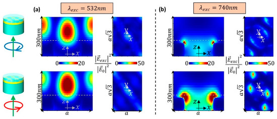 Passive simulations of the electric field intensity enhancement for the Au-ENHA, when its excited with RCP (top), or LCP (light) from the bottom. We plot normalized electric field intensity in two-unit cell cross-sections, detected by xz-monitor (centered at y = 0 nm), and xy-monitor (situated at z = 120 nm), at (a) 532 nm, and (b) 740 nm.
